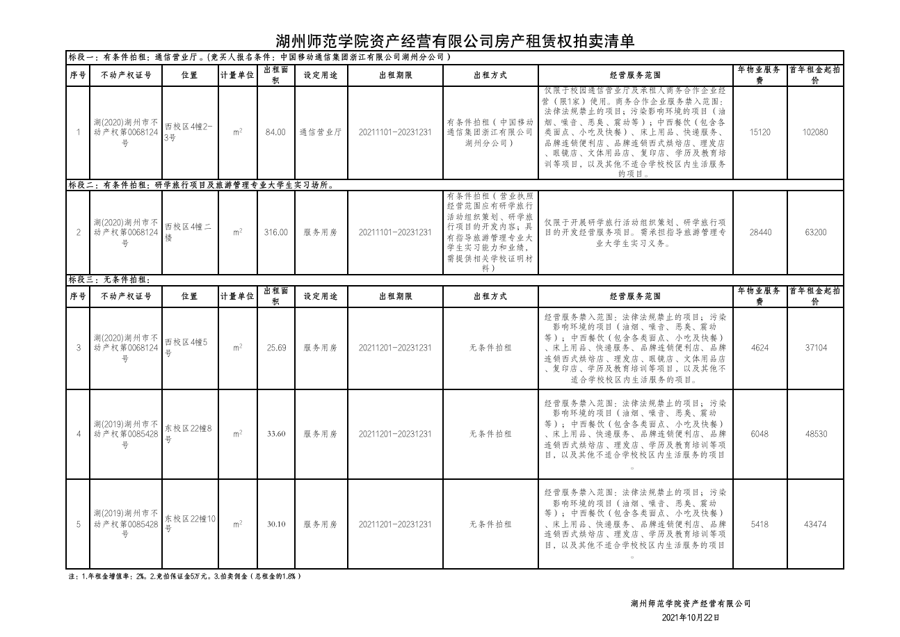 湖州師范學院資產(chǎn)經(jīng)營有限公司房產(chǎn)租賃權(quán)(5處)。具體座落位置、建筑面積、租賃期限、年租金起拍價詳見《湖州師范學院資產(chǎn)經(jīng)營有限公司房產(chǎn)租賃權(quán)拍賣清單》(附件)。