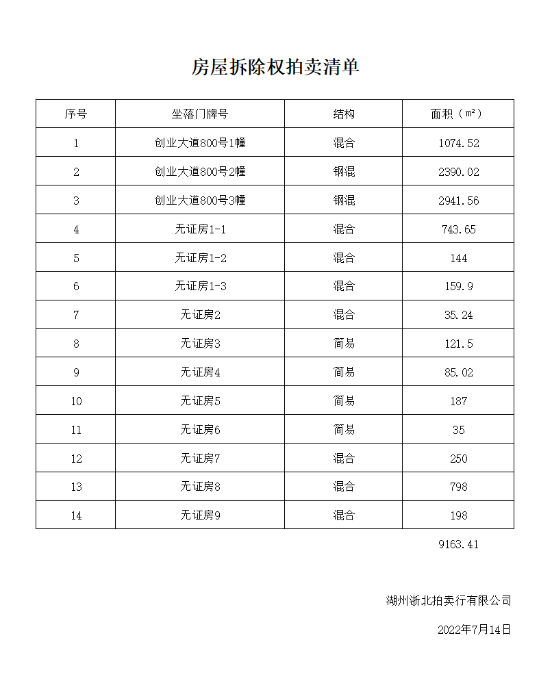 湖州市創(chuàng)業(yè)大道800號1-3幢及11處無證房產(chǎn)拆除權(quán)。具體面積詳見《房屋拆除權(quán)拍賣清單》,起拍價(jià)24.1萬元。