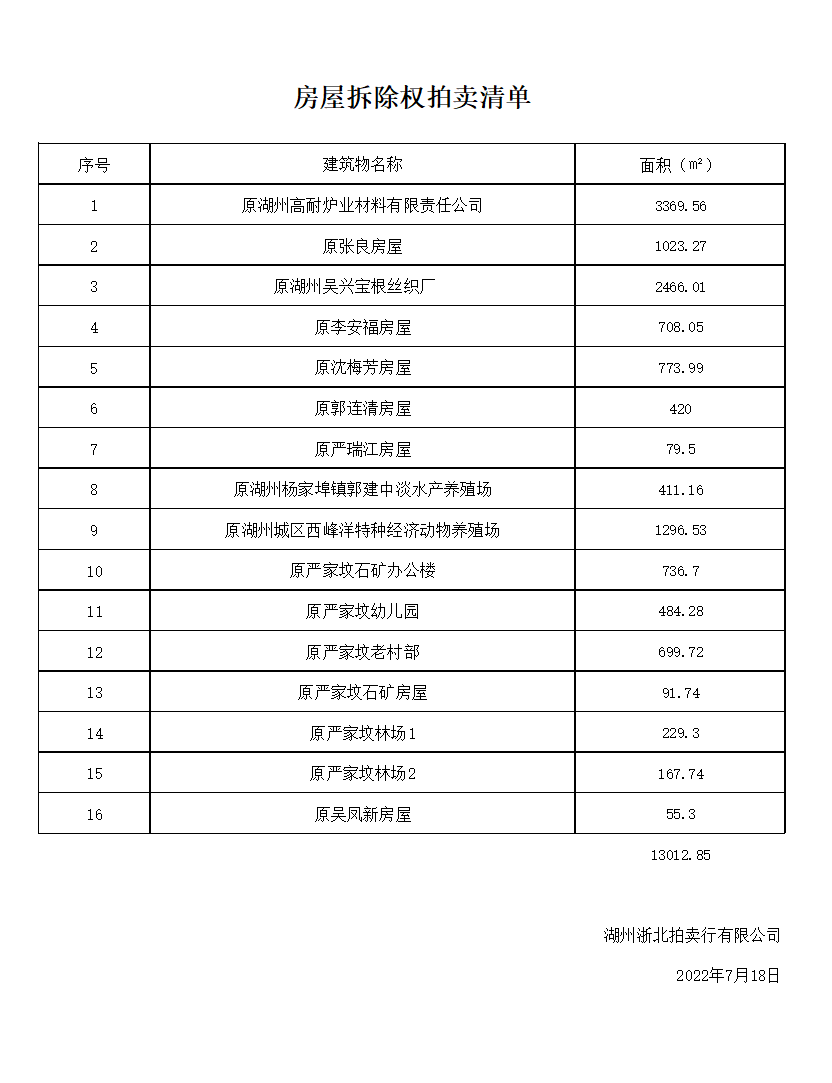 湖州市科學(xué)谷(位于嚴(yán)家墳老村部地塊及周邊)的一批房屋拆除權(quán)。具體面積詳見《房屋拆除權(quán)拍賣清單》,起拍價(jià)44.8萬元。