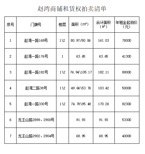 浙江省湖州市趙灣一路、趙灣二路、龍王山路共7個商鋪,坐落位置、建筑面積、年租金起拍價等詳見《趙灣商鋪租賃權(quán)拍賣清單》,五年租賃使用權(quán)。設有保留價。
