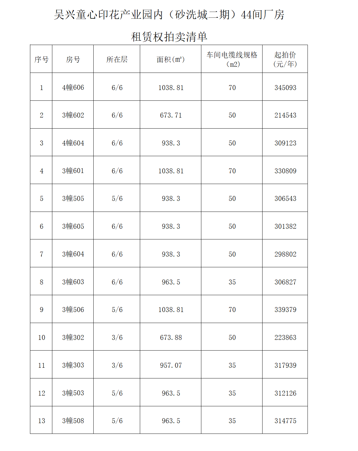 湖州市吳興童心印花產(chǎn)業(yè)園內(nèi)44間廠房租賃使用權(quán),租賃期限自2023年3月1日起至2026年1月15日止。租金采用“一年一付,先付后用”原則。廠房坐落位置、建筑面積、年租金起拍價(jià)詳見(jiàn)《廠房租賃使用權(quán)拍賣清單》。
