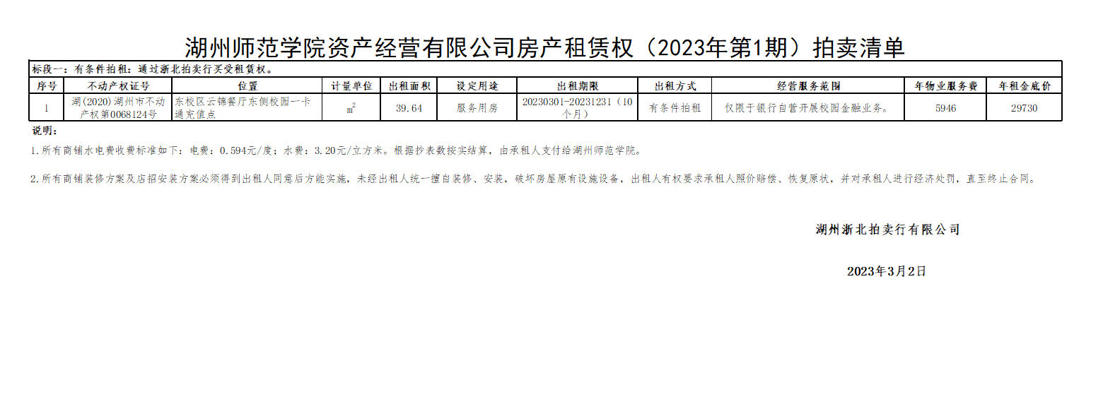 湖州師范學(xué)院資產(chǎn)經(jīng)營(yíng)有限公司房產(chǎn)租賃權(quán)(1處)。具體座落位置、建筑面積、租賃期限、年租金起拍價(jià)詳見(jiàn)《湖州師范學(xué)院資產(chǎn)經(jīng)營(yíng)有限公司房產(chǎn)租賃權(quán)(2023年第1期)拍賣(mài)清單》(本公司網(wǎng)站)。