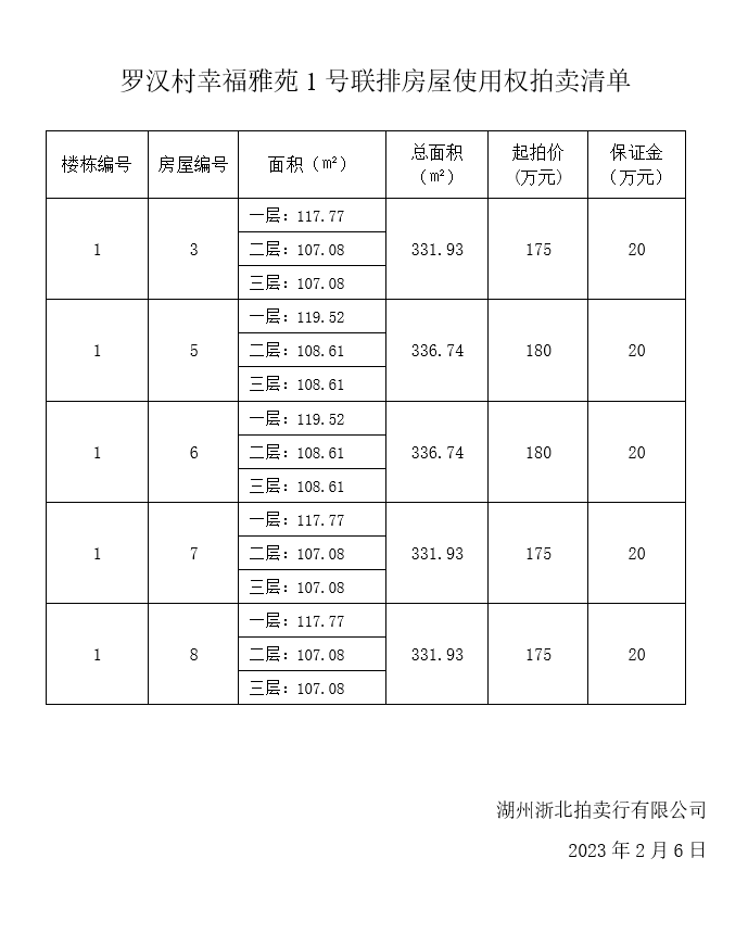 位于浙江省湖州市南潯區(qū)舊館街道羅漢村幸福雅苑1號聯(lián)排房屋使用權。房屋編號、面積、起拍價詳見《羅漢村幸福雅苑1號聯(lián)排房屋使用權拍賣清單》。以上標的均有保留價。