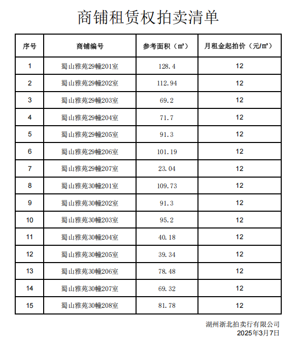 1、浙江省湖州市吳興區(qū)蜀山雅苑29幢第二層201室至207室及30幢第二層201室至208室,共15個商鋪。五年租賃使用權(quán),起拍價每平方米月租金12元(按凈面積計算)。具體商鋪編號,參考面積詳見清單。